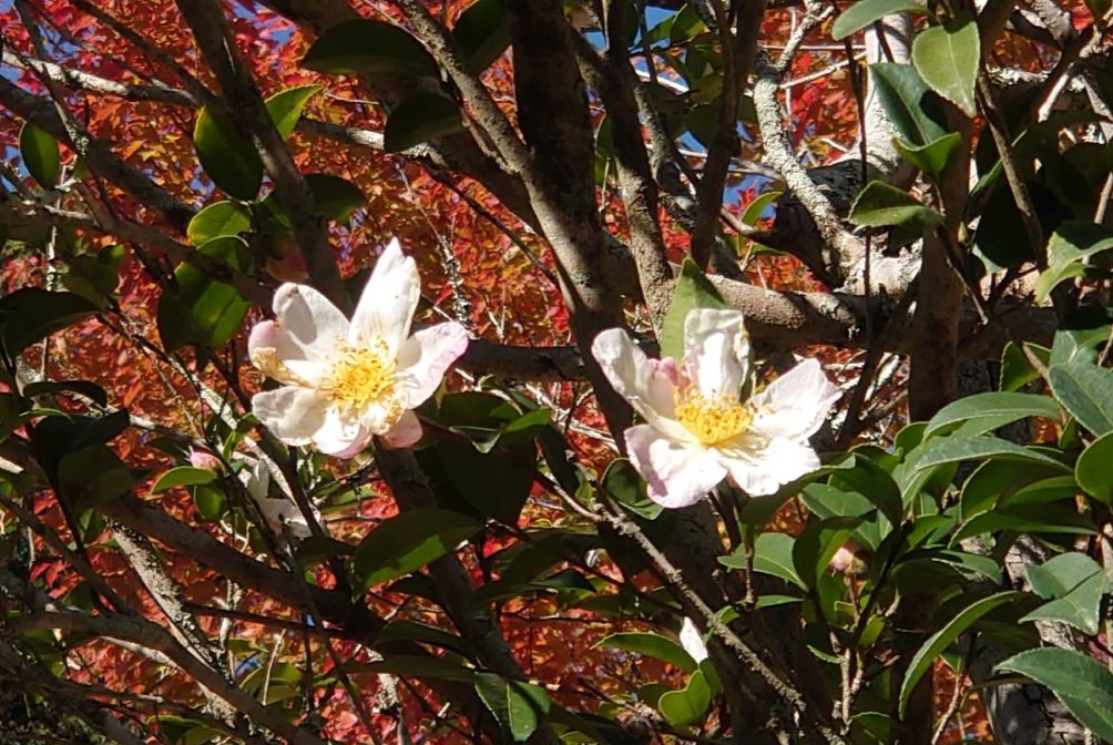 11月 白い山茶花(サザンカ)とピンクの木槿(ムクゲ)の花