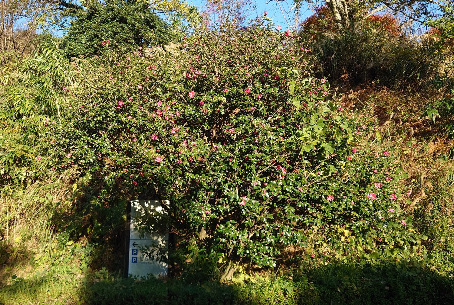11月 グラウンドゴルフ場の山茶花(サザンカ)の花