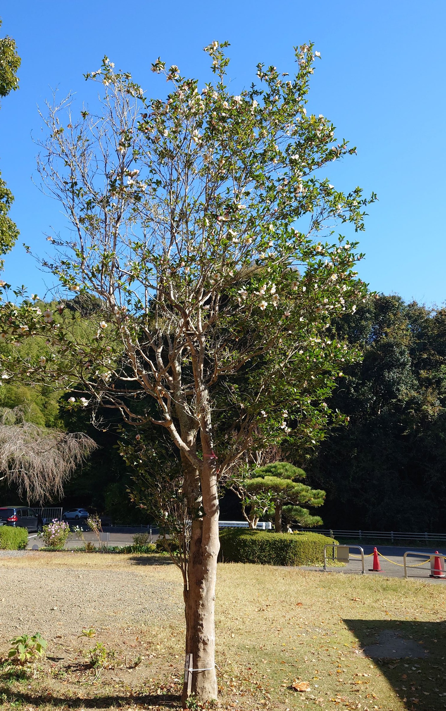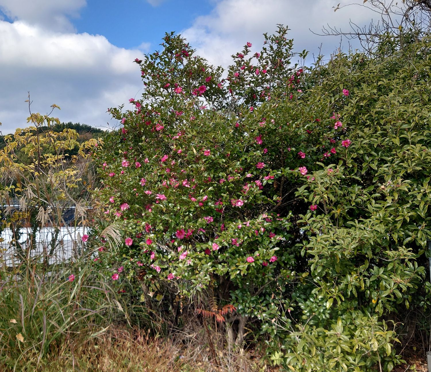 11月 グラウンドゴルフ場の山茶花(サザンカ)の花