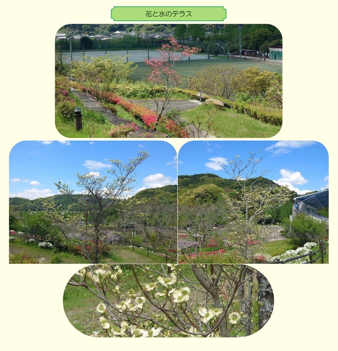 中央広場北側のサッカー場外周や花と水のテラスにあるハナミズキに